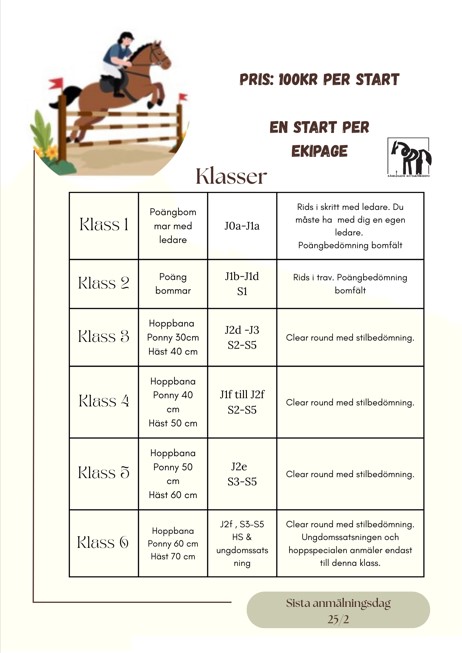 Anmäl på anslag i stallet. För Er som rider i ungdomssatsningen på fredagar ingår startavgiften.
